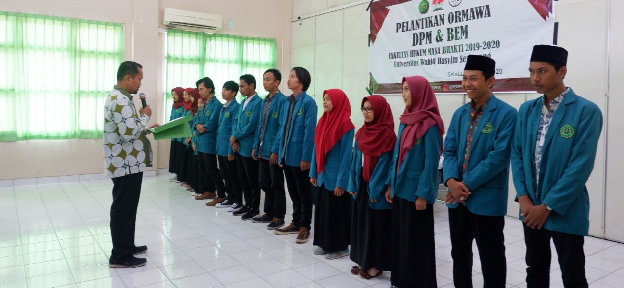 Pengurus DPM dan DPM Fakultas Hukum Universitas Wahid Hasyim Semarang Periode 2019 -2020 dilantik oleh Dekan Dr. Mastur, SH, MH pada hari Selasa, 14 Januari 2020 di ruang C3.04-C3.05 Gedung C Fakultas Hukum. Kegiatan Pelantikan Pengurus DPM dan BEM dilanjutkan Doa BersamaMujahadah Rutin Selapanan sekaligus Doa agar lancar dan sukses dalam menghadapi UAS semester Gasal 20192020 yang akan dimulai Hari Jumat 17 Januari 2020. Dalam sambutannya Dekan Fakultas Hukum berpesan Bahwa Pasca Pelantikan DPM dan BEM Fakultas Hukum 2029-2020 diharapkan bisa mengemban amanah sebagai pengurus dan menjalankan program satu tahun kedepan dengan maksimal. Dekan juga berpesan agar Pengurus DPM dan BEM Fakultas Hukum baru dapat meningkatkan kegiatan dan prestasi kemahasiswaan baik akademik maupun non akademik dan menunjukkan eksistensi dan perannya DPM dan BEM Fakultas Hukum dikancah Universitas, Kota Semarang dan Jawa Tengah sehingga bisa membanggakan Alamamater. Dr. mastur juga menyampaikan banyak terimakasih kepada pengurus DPM dan BEM lama yang sudah menjalankan jalan organisasi Mahasiswa di tingkat Fakultas, dan bagi Pengurus baru diharapkan bisa menjalankan tugas mandat dari mahasiswa dengan sebaik-baiknya.