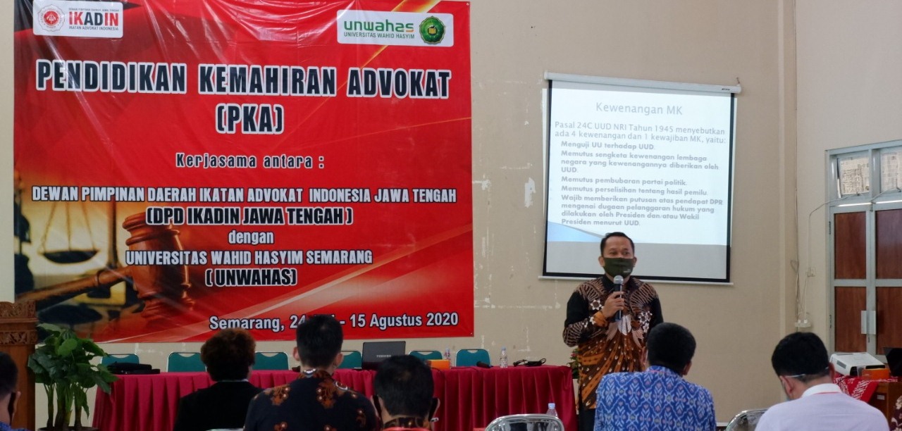 Fakultas Hukum Universitas Wahid Hasyim Semarang menyelenggaakan Pendidikan Kemahiran Advokat (PKA) bekerjasama dengan IKADIN JAwa Tengah, Kegiatan PKA ini berlangsung Mulai tanggal 24 juli – 15 Agustus 2020 di Gedung C3. Fakultas Hukum Kampus 1 Menoreh Tengah.