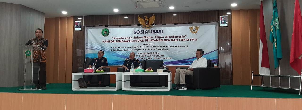 Fakultas Hukum Universitas Wahid Hasyim Bekerjasama dengan Kantor Pengawasan dan Pelayanan BEA dan CUKAI Tanjung Mas menyelenggarakan Sosialisasi dengan tema &rsquo Kepabeanan dalam Ekport Import di Indonesia , bertempat di Aula Fakultas Kedokteran Universitas Wahid Hasyim pada Senin, 16 Desember 2019.