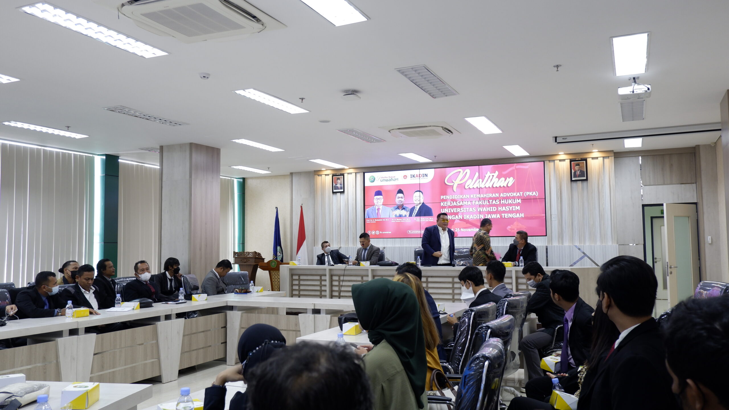 Fakultas Hukum Universitas Wahid Hasyim Semarang bekerjasama dengan IKADIN JATENG meneyelenggarakan Pendidkan Kemahiran Advokat, Pelaksanaan dimualai 25 Nov -10 Desember 2022 di Kampus I Unwahas Meneroh Tengah X . Pembukaan Oleh Rektor UNWAHAS Prof Dr Mudzakkir Ali, MA pada hari Jumat 25 November 2022 di Ruang Sidang Dekanat Lt 6 Kampus 1. Dalam Pembukaan pelatihan Kemaharian Advokat dihadiri Dekan Fakultas Hukum Unwahas Dr Mastur, SH, MH , Ketua IKADIN Jateng Dr Aan Tawli, SH, MH dan para pengurus IKADIN lainnya . Dalam Pelatihan kali ini peserta yang ikut sebanyak 51 orang. Dalam Sambutannya Dekan Fakultas Hukum Dr Mastur SH, MH menyampaikan agar kegiatan Pelatihan ini agar bisa diikuti dengan baik agar nanti para peserta lulus ujian dan dapat disumpah dan nantinya bisa menjadi advokat yang profesional, handal dan selalu menjunjung tinggi profesi Advokat. Dr Aan Tawli dalam sambutannya bahwa organisasi IKADIN merupakan organisasi Advokat yang sholid dan secara administrasi dan legal formal paling lengkap dibandingkan organisasiasosiasi Advokat lainnya sehingga para peserta tepat mengikuti dan bergabung Pendidikan Kemahiran Advokat IKADIN.