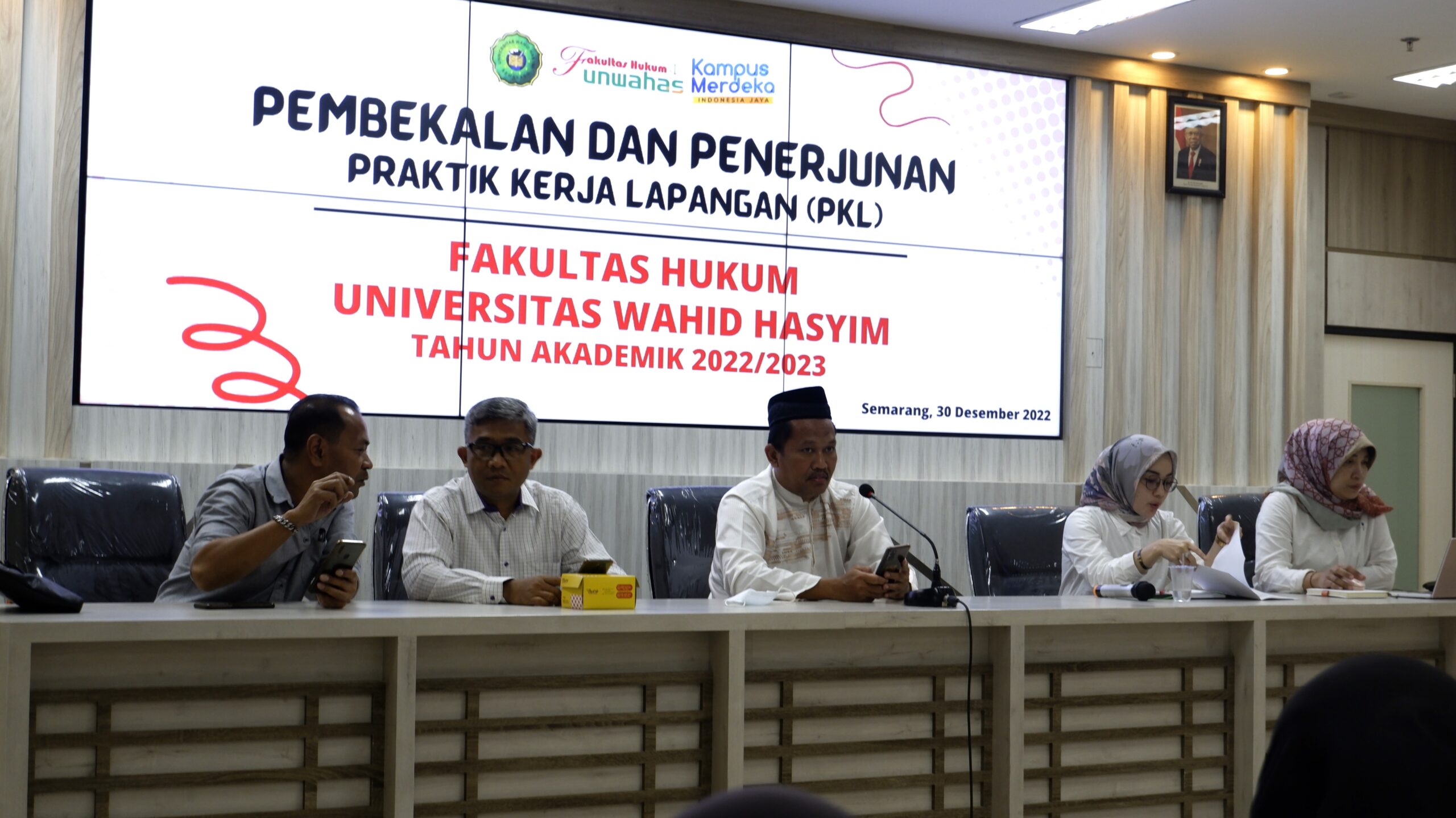 30 Desember 2022, Dekan FH Unwahas Dr. Mastur, S.H., M.H. menerjunkan 90 mahasiswa PKL semester gasal TA 2022-2023 yang tersebar di beberapa instansi yang telah bekerjasama dengan Fakultas Hukum diantaranya Kanwil Kemenkumham Jawa Tengah, Polda Jateng, Ikadin Jateng, Lembaga Perlindungan Konsumen Jateng, dll. kegiatan tersebut juga sekaligus pemberian pembekalan kepada mahasiswa praktikan yang nantinya akan terjun langsung ke lapangan yakni tempat mereka melakukan Praktik Kerja Lapangan agar lebih siap dalam menjalani kegiatan PKL kedepannya, hal itu diberikan langsung oleh ketua panitia pelaksana yakni Ibu Dr. Hetiyasari, S.H., M.Kn. dan Sekretaris Ibu Dr. Arum Widiastuti, S.H., M.H. Dalam proses kegiatan pembekalan dan penerjunan PKL yang diselenggarakan di gedung dekanat lantai 6 Unwahas Semarang tersebut juga dihadiri oleh semua peserta PKL baik itu secara offline maupun online via zoom meeting serta Dosen Pembimbing Lapangan yang nantinya akan membimbing selama kegiatan PKL berlangsung. PKL tersebut merupakan salah satu mata kuliah wajib yang harus di tempuh oleh mahasiswa Sarjana karena itu merupakan kurikulum yang ada dalam Prodi Ilmu Hukum Fakultas Hukum Universitas Wahid Hasyim yang nilai SKS nya 1 SKS. Dalam kesempatanyya Dekan FH Unwahas berpesan kepada mahasiswa praktikan agar memanfaatkan waktu sebaik-baiknya untuk belajar banyak tentang dunia kerja, disiplin, senantiasa menjaga nama baik Instansi dan menjaga sopan santun serta mentaati peraturan yang ada dalam instansi tempat dimana mahasiswa tersebut melakukan PKL.